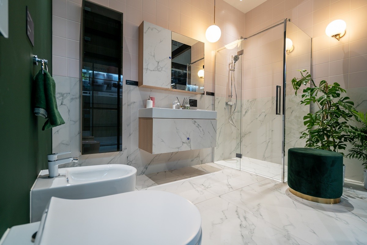 Zaraz po wejściu do wnętrza stoiska można było podziwiać aranżację przygotowaną specjalnie dla młodej pary. Propozycja wykończenia łazienki dla dwojga opierała się na wykorzystaniu stylu minimalistycznego. Piękno prostoty zostało podkreślone dzięki płytkom z kolekcji MARATONA oraz meblom łazienkowymi z kolekcji CREA od Cersanit. Dla współczesnych singielek marki przygotowały iście instagramową łazienkę pełną najnowszych trendów, takich jak marmur, ciemna zieleń czy pastelowy róż. W projekcie tej przestrzeni, wykorzystana została kolekcja MONOBLOCK marki Opoczno, marmur CALACATTA – również z propozycji Opoczno oraz ceramika z najnowszej kolekcji Cersanit - INVERTO.